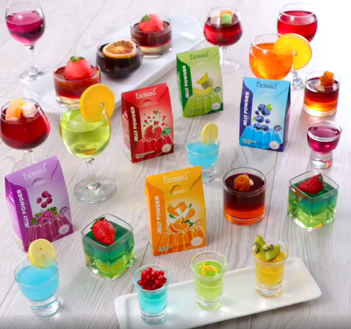 این خوراکی حاوی پودر ژلاتین است که با ترکیب کردن آب و قرار دادن در دمای سرد شکل می گیرد علاه بر این، برای تقویت استخوانها مفید می باشد و باوجود ویتامین B، برای بهبود افسردگی هم مناسب است. پودر ژله در طعمهای مختلفی تولید میشود اما ترکیب آنها با یکدیگر بسیار زیباتر و خوشمزهتر است. ترکیب ژله با تکههای میوه نیز بسیار جذاب است و میتواند به هضم غذا کمک کند.